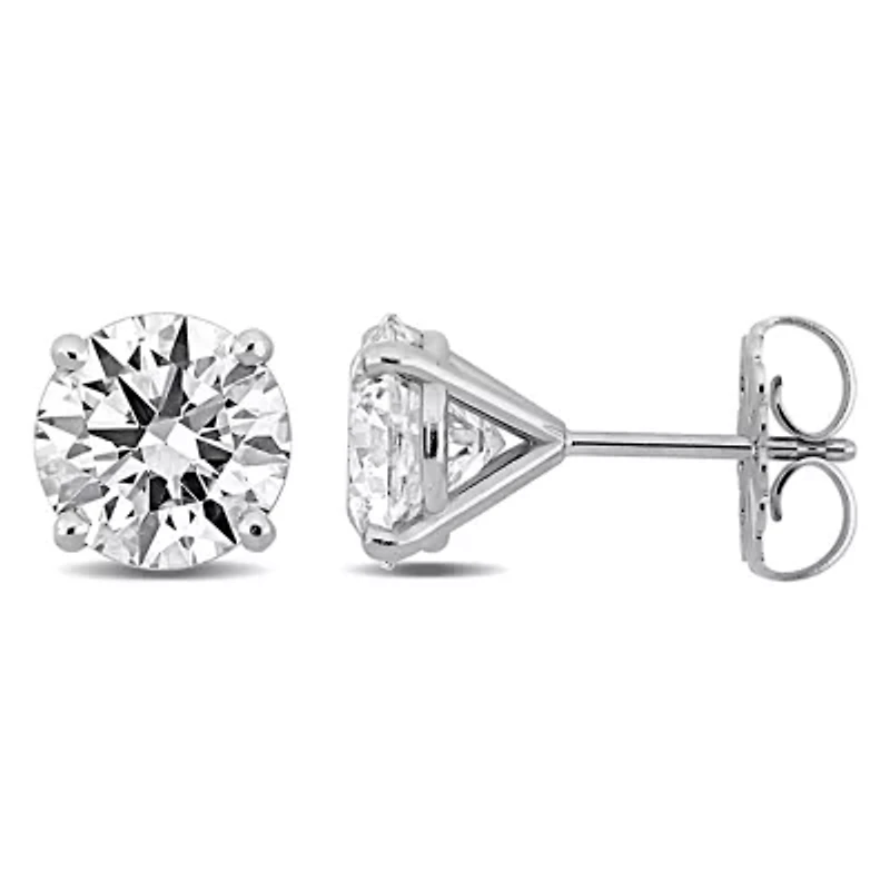 Make a striking statement with these 14k white gold martini-style stud earrings. Featuring lab-grown diamonds in a sleek three-prong setting, they sit elegantly at the ear, catching light from every angle for maximum sparkle. Their timeless design combines modern sophistication with classic brilliance, perfect for both everyday elegance and special occasions. More than earrings, they embody confidence, style, and enduring beauty. Post back, Butterfly clasp, 2 lab grown diamond Color rating: F Clarity rating: VS1 Polished finish Prong setting Warranty available, 60 days Canada Imported Product Specifications 4 ct. t.w. lab grown diamond Material & Care 14K White Gold Metal, White gold Clean with a soft cloth.