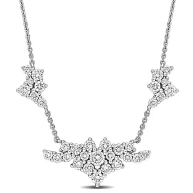 Elevate any ensemble with this 14k white gold statement necklace. Featuring a dazzling arrangement of lab-grown diamonds, it captures light from every angle, creating a brilliant, eye-catching sparkle. Its bold yet elegant design blends modern sophistication with timeless glamour, perfect for making every moment unforgettable. More than jewelry, it’s a symbol of confidence, style, and refined beauty. Lobster closure, 34 lab grown diamond Color rating: H, G Clarity rating: VS1-VS2 Polished finish Prong setting Warranty available, 60 days Thailand Imported Product Specifications 17" 1.62 ct. t.w. lab grown diamond Material & Care 14K White Gold Metal, White gold Clean with a soft cloth.