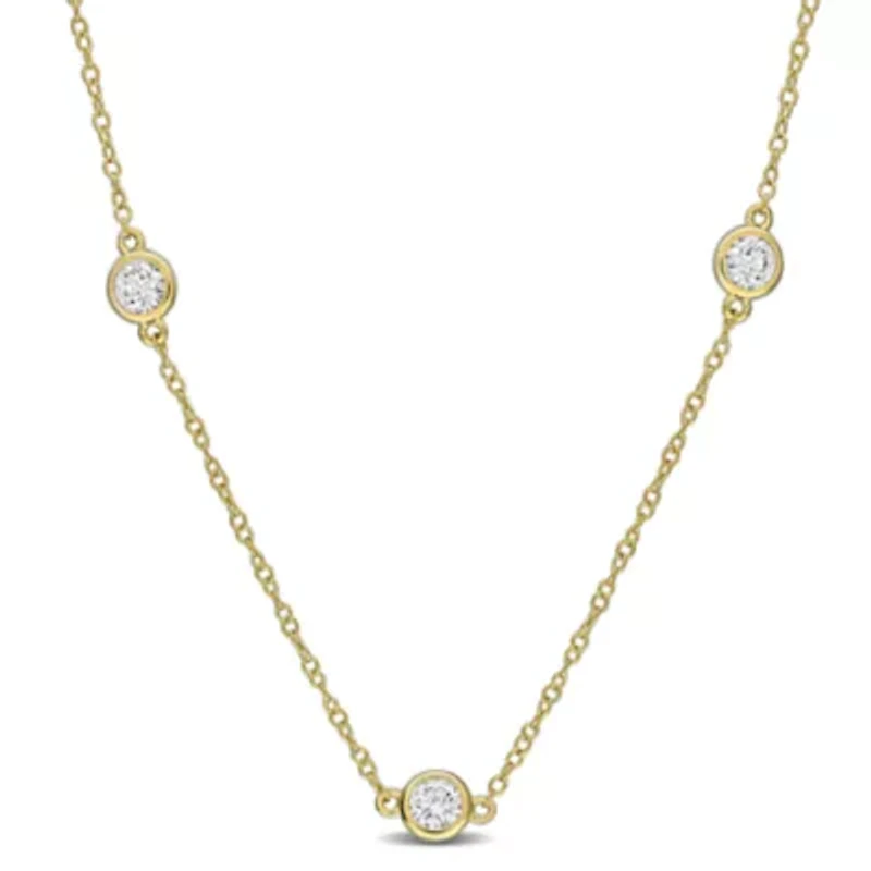 Add subtle sparkle to any look with this 16-inch yellow plated sterling silver station necklace. Featuring lab-grown diamonds thoughtfully spaced along a delicate chain, each stone catches the light beautifully, creating a soft, radiant shimmer. Its elegant, minimalist design blends timeless sophistication with modern charm, making it perfect for both everyday wear and special occasions. More than a necklace, it’s a symbol of style, grace, and enduring beauty—a piece that elevates every moment with effortless elegance. Lobster closure, 5 lab grown diamond Color rating: G, H Clarity rating: VS1-VS2 Polished finish Bezel setting Warranty available, 60 days Thailand Imported Product Specifications 8.2-mm width x 5.1-mm height, 16" 1 ct. t.w. lab grown diamond Material & Care Sterling Silver Metal, Sterling silver Clean with a soft cloth.