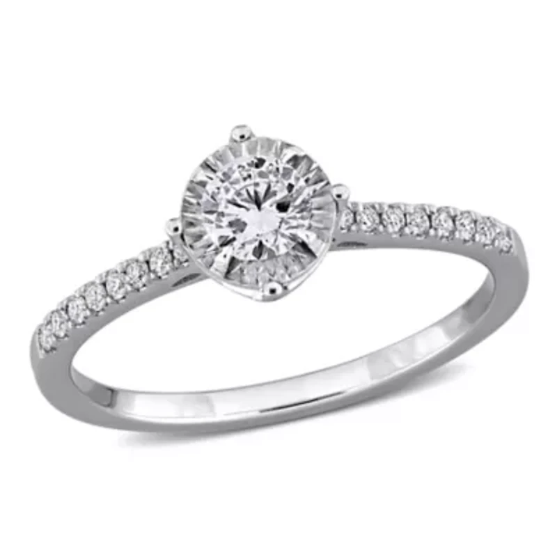 Celebrate timeless love with this 18k white gold halo solitaire engagement ring. At its heart, a brilliant lab-grown diamond is framed by a sparkling halo of smaller diamonds, enhancing its radiance and creating a captivating sparkle from every angle. The elegant setting balances classic sophistication with modern refinement, making it a perfect symbol of devotion and commitment. More than a ring, it embodies love, confidence, and enduring beauty—a cherished piece to celebrate every special moment. 17 lab grown diamond Color rating: H, G Clarity rating: VS1-VS2 Polished finish Prong setting Warranty available, 60 days Thailand Imported Belk Exclusive Product Specifications 7-mm width x 19.3-mm height 1/3 ct. t.w. lab grown diamond Material & Care 18K White Gold Metal, White gold Clean with a soft cloth.