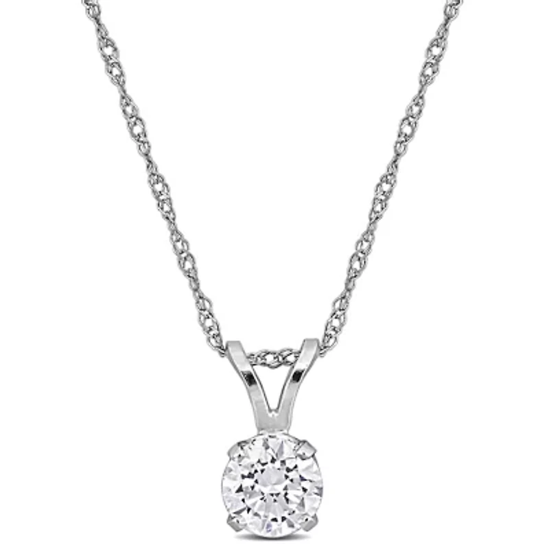 This refined lab-grown diamond solitaire pendant is set in 14k white or yellow gold and features a single, beautifully cut diamond that captures light from every angle. The classic solitaire design is suspended on a delicate chain, creating a timeless piece that balances elegance with everyday wearability. Its secure setting ensures durability while highlighting the diamond’s brilliance. Perfect as a thoughtful gift or as a versatile addition to elevate any jewelry collection. Spring ring clasp, 1 lab grown diamond Color rating: E, F Clarity rating: SI1 Polished finish Prong setting Warranty available, 60 days Canada Imported Product Specifications 5-mm width x 10.25-mm height, 17" 1/2 ct. t.w. lab grown diamond Material & Care 14K White Gold Metal, White gold Clean with a soft cloth.