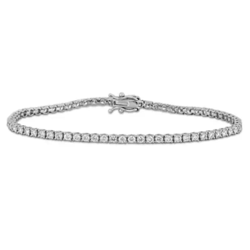 Add effortless sparkle to any look with this 14k white gold tennis bracelet. Featuring a continuous line of lab-grown diamonds, it glimmers brilliantly from every angle, combining classic elegance with modern sophistication. Its sleek, refined design makes it perfect for both everyday wear and special occasions. More than jewelry, it’s a symbol of timeless style, confidence, and enduring beauty. Box clasp, 67 lab grown diamond Color rating: H, G Clarity rating: VS1-VS2 Polished finish Prong setting Warranty available, 60 days Thailand Imported Product Specifications 2.5-mm Width, 7" 2.35 ct. t.w. lab grown diamond Material & Care 14K White Gold Metal, White gold Clean with a soft cloth.