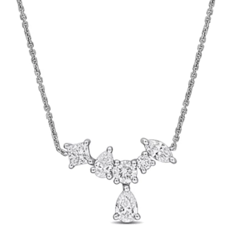 Elevate any ensemble with this 17-inch 14k white gold drop necklace. Featuring a stunning arrangement of multi-shaped lab-grown diamonds, it sparkles brilliantly with every movement. Its graceful, cascading design blends modern elegance with timeless sophistication, perfect for both everyday wear and special occasions. More than a necklace, it embodies style, confidence, and refined beauty. Lobster closure, 6 lab grown diamond Color rating: H, G Clarity rating: VS1-VS2 Polished finish Prong setting Warranty available, 60 days Thailand Imported Product Specifications 20-mm width x 14.6-mm height, 17" 1.34 ct. t.w. lab grown diamond Material & Care 14K White Gold Metal, White gold Clean with a soft cloth.