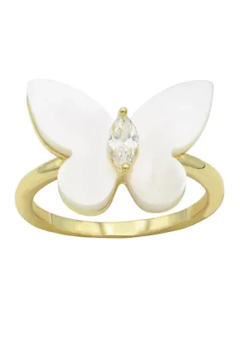 Lab Grown Gold Tone Mother of Pearl Butterfly with Clear Cubic Zirconia Ring