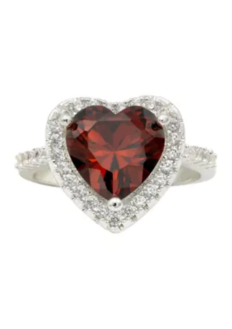 Lab Grown Silver Tone Red Crystal Heart Ring with Clear Cubic Zirconia Halo in Chattanooga, TN