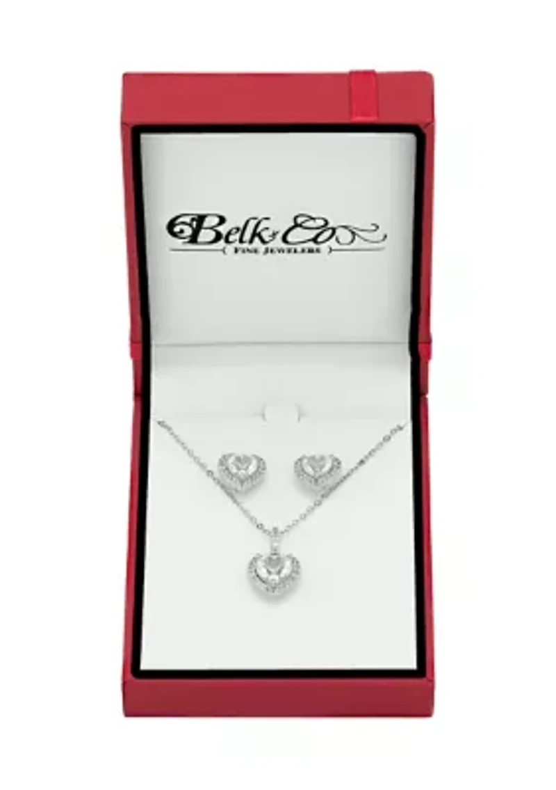 This exquisite jewelry set from Belk & Co. features a charming heart-cut design. The set includes delicate stud earrings and a matching pendant suspended from an 18" cable chain. Sparkling white sapphires, totaling 71 stones, are meticulously set to catch the light. 2-piece set Post back closure, fish hook closure 71 Grown White Sapphire Polished finish Prong setting Imported Belk Exclusive Product Specifications Earirngs: 0.38" x 0.38";