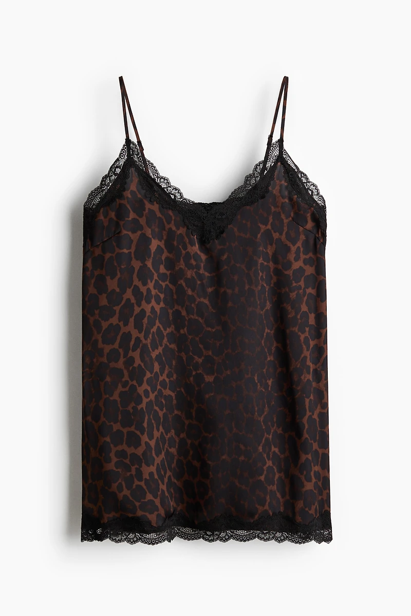 Short nightgown in softly draped satin. Adjustable, extra-narrow shoulder straps, low-cut V-neck, and delicate lace trim at upper edge and at hem.