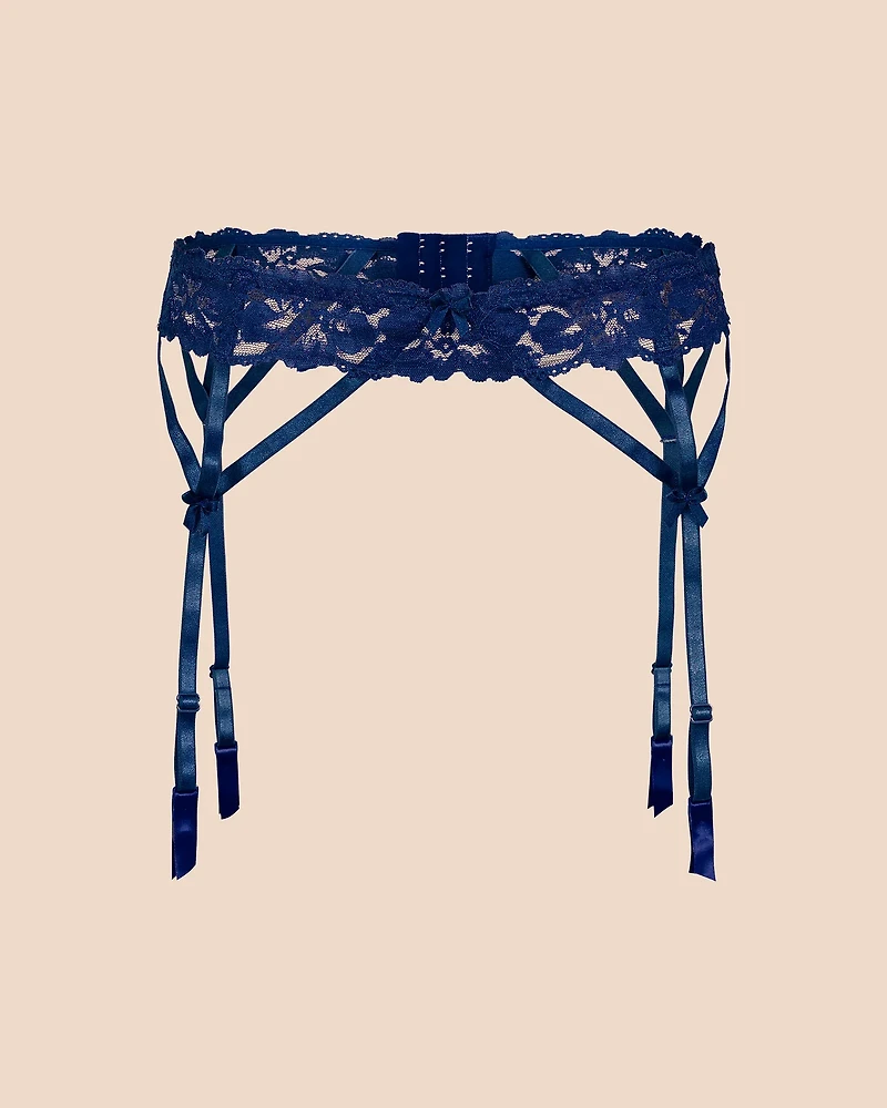 The Lacie Dark Blue lace garter belt lingerie is a bold-fashion statement piece. Effortlessly elevate your look with its striking design and unforgettable style. (Available in sizes XS-XL.)