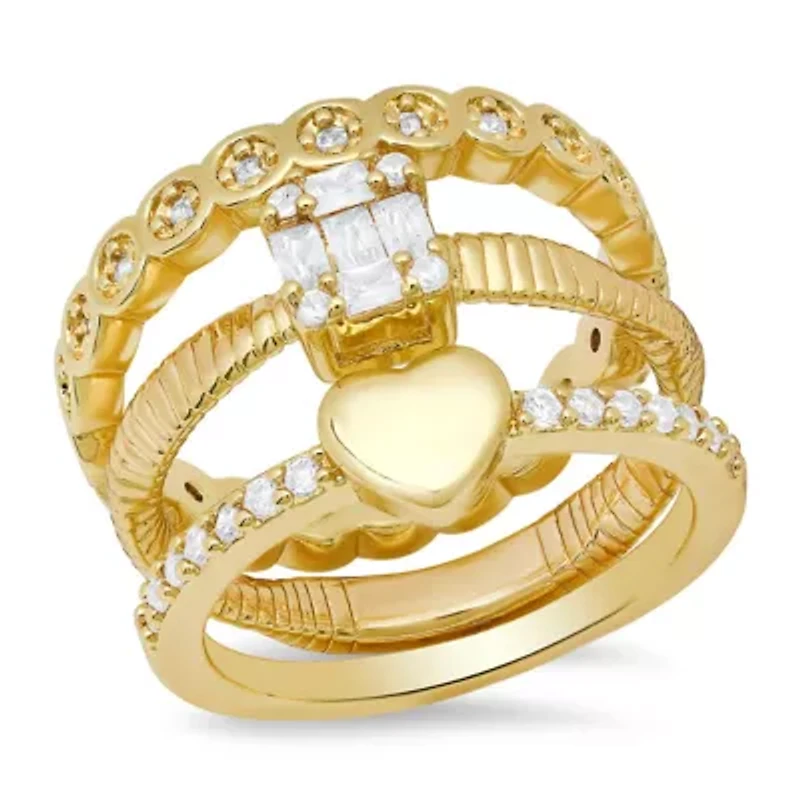 Ladies 18k gold plated brass simulated diamonds stackable ring No clasp, 62 Imported Product Specifications heart band: shank: 1.7mm/head: 7.5mm, there are 13 total stones, 1.25mm=0.01cts/0.13 total carats, band: shank: 1.5mm/head: 2.5mm, there are 11 total stones, 1.8mm=0.025cts/0.28 total carats, bow band: shank: 1mm/head: 4.3mm, there are 38 total stones, 1.5mm=0.015cts/0.57 total carats 0.98 Material & Care brass Gold plated Clean with a soft cloth.