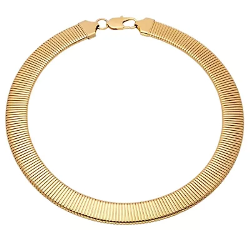 Ladies 18k gold plated stainless steel omega necklace Lobster closure Imported Product Specifications 16" L x 0.5" W Material & Care stainless steel Stainless steel Clean with a soft cloth.