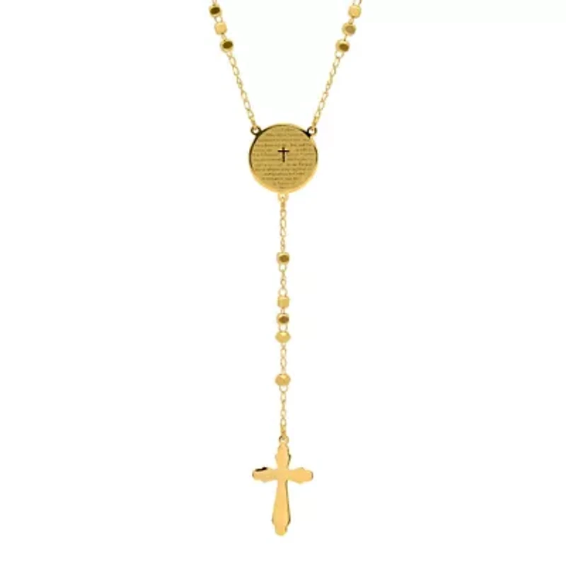 Ladies 18k gold plated stainless steel Our Father prayer box beaded rosary necklace Lobster closure Imported Product Specifications 20" L x 0.1" W, charm: 18mm, 4" drop, cross: 25mm L x 15mm W Material & Care stainless steel Stainless steel Clean with a soft cloth.