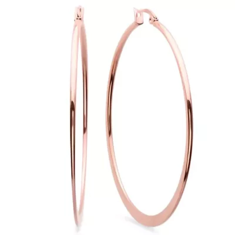 Ladies 18k rose gold plated 60mm knife accent hoop earrings 2 Click top closure, Pinch Imported Product Specifications .1"X.1"X2.4" Material & Care stainless steel Rose gold Clean with a soft cloth.