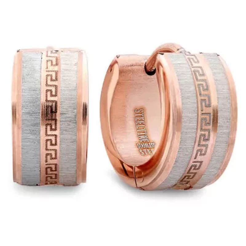 Ladies 18k rose gold plated stainless steel huggie with greek key and stainless steel accent 2 Hinge post earring, Pinch Imported Product Specifications .5''L x .3''W Material & Care stainless steel Rose gold Clean with a soft cloth.