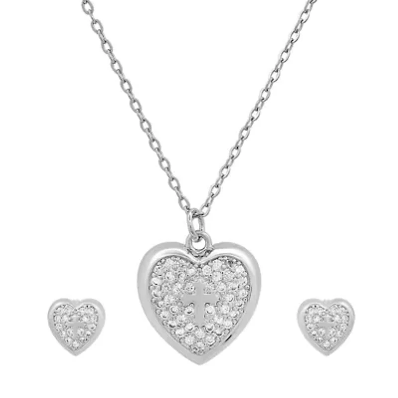Ladies 18k white gold plated brass simulated diamonds heart shape earrings/pendant set with cross accents