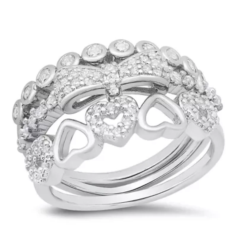 Ladies 18k white, yellow and rose gold plated brass simulated diamonds stackable ring No clasp, 60 Imported Product Specifications bow band, shank: 1mm/head: 4.3mm, there are 28 total stones, 1.5mm=0.015cts/0.42 total carats, band: shank: 1.5mm/head: 2.5mm, there are 11 total stones, 1.75mm=0.02cts/0.22 total carats, heart band: shank: 1.5mm/head: 5mm, there are 21 total stones, 1.25mm=0.01cts/0.21 total carats 0.85 Material & Care brass Tri-Tone Clean with a soft cloth.