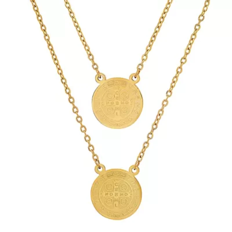 Ladies 18kt gold plated stainless steel st benedict double circle laser engraved scapular religious necklaceLadies 18kt gold plated stainless steel st benedict double circle laser engraved scapular religious necklace