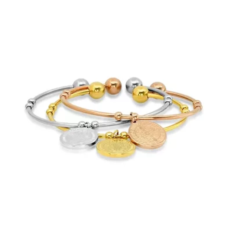 Ladies 3pc stainless steel, 18k gold plated, and 18k rose gold plated St. Benedict charms cuff bracelet No clasp Imported Product Specifications 6-7" L x 0.1" W, charms: 16mm Material & Care stainless steel Tri-Tone Clean with a soft cloth.