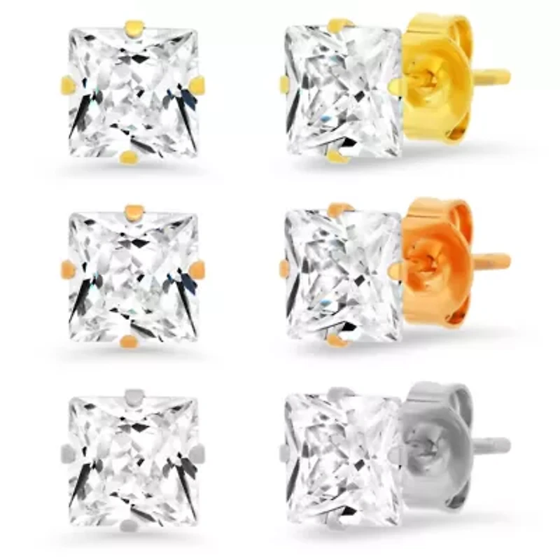 Ladies set of 3pcs stainless steel, 18k gold plated, and 18k rose gold plated princess cut simulated diamond stud earrings 2 Post back, Butterfly clasp Imported Product Specifications 6mm, 1.24 ctw each stone Material & Care stainless steel Tri-Tone Clean with a soft cloth.