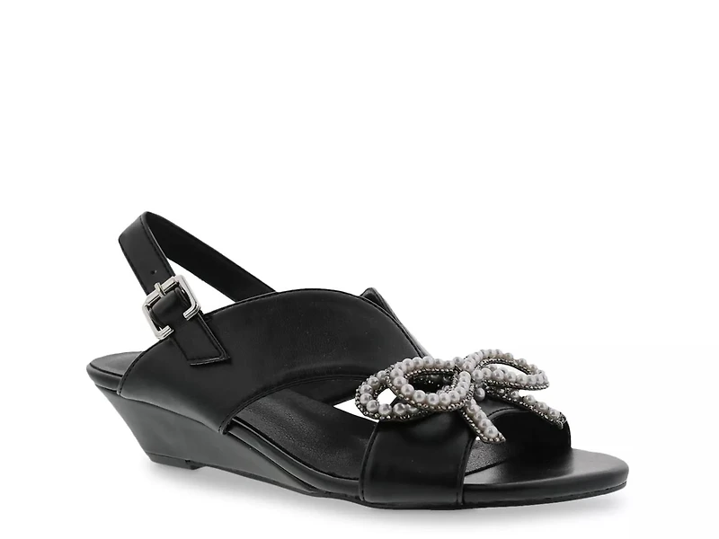 Enhance your style score with the Lady wedge sandal from Bellini. Smooth pearl embellished bow detail adorns this vegan synthetic sandal designed with an adjustable slingback strap, comfy foam padded footbed and a low wedge.