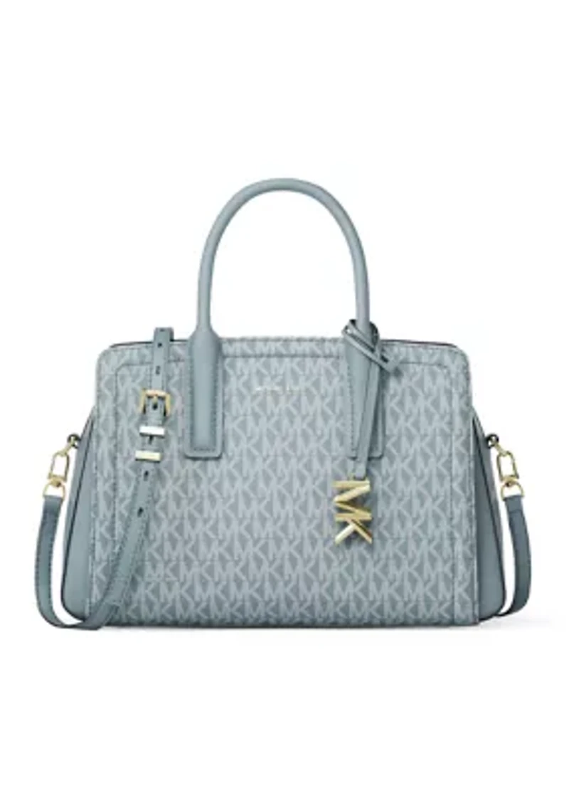 This stylish satchel, designed for women, offers convenient organization with multiple interior and exterior pockets, including a center zip compartment for added security. Crafted from durable PVC, it features a removable strap with an adjustable drop length, providing versatile carrying options. Its compact dimensions make it perfect for everyday use, while the design ensures a fashionable look. Double top handles with 3.5" drop Removable strap with 21"-24" drop Interior: 1 back slip pocket, 1 center zip compartment, 1 back zip pocket Imported Product Specifications 10" W x 7.25" H x 4.75" D Material & Care PVC Wipe clean