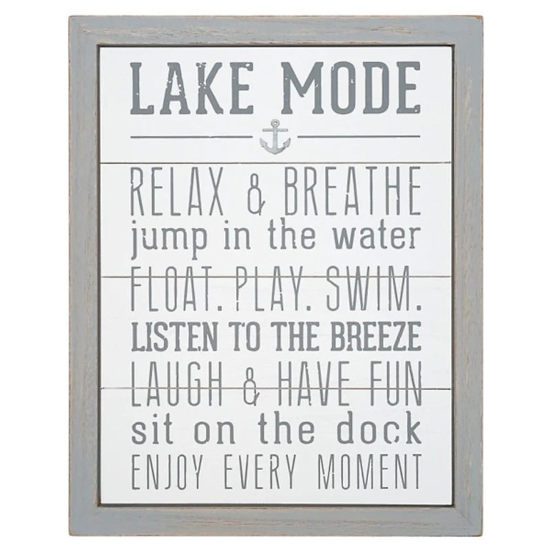 Evoke a sense of relaxation in your lake house with this Lake Mode Framed Wall Plaque. Whether you want to swim or sit on the dock, this wall decor invites you to spend a day on the lake. Overall dimensions Width: 12 in. Depth: 1.25 in. Height: 15 in. Crafted of MDF and wood veneer Gray frame finish White background finish Features the text "Lake Mode" followed by lake-inspired messages Hues of gray and white Weight: 2.5 lbs. Hangs from back-mounted hardware Care: Dust with a soft, dry cloth. This item is available at Kirklands.com only, not available in stores. Please note: this item cannot be shipped to APO/FPO addresses.