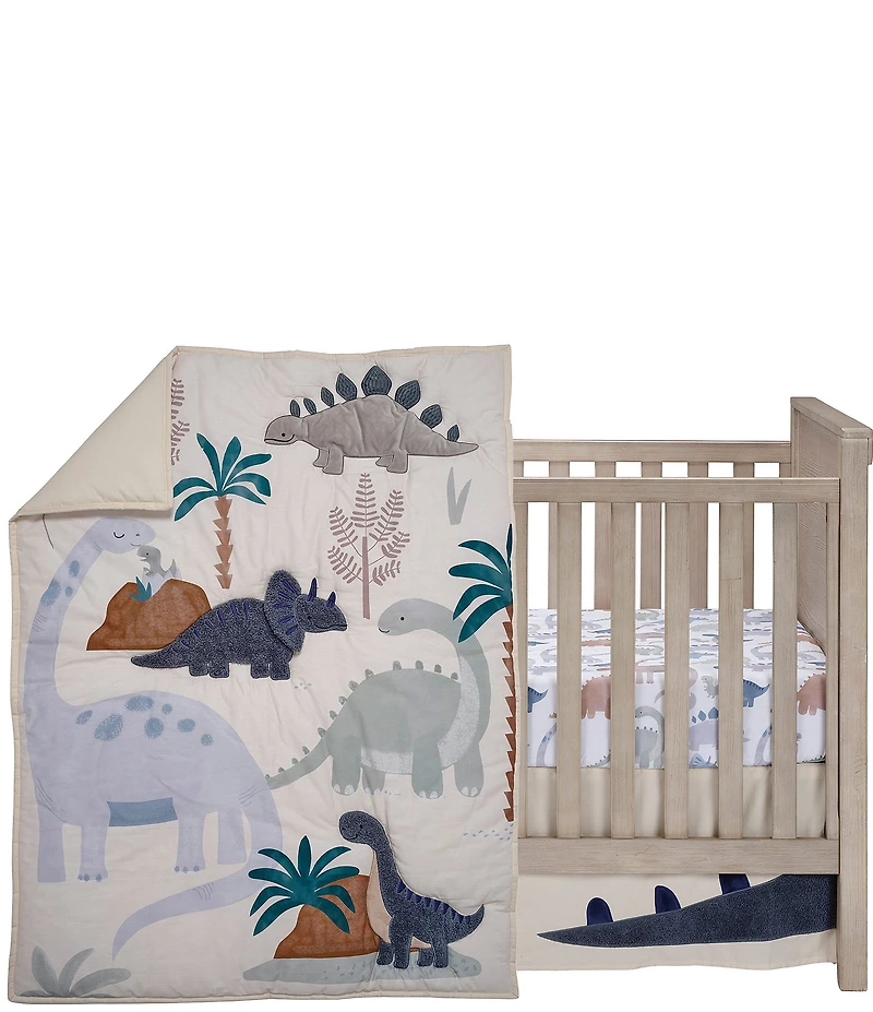 From Lambs & Ivy, this 3-piece crib bedding set features: Made of pure cotton twill Your little one will drift off to dreamland with their favorite prehistoric creatures playing hide and seek among ancient trees and Jurassic rocks Features prehistoric dinosaurs playing hide and seek among ancient trees and Jurassic rocks Several dinosaurs are expertly appliqued in luxurious blue velour and textured boucle fabrics to provide sensory experiences for baby The watercolor style printed fitted crib sheet features multi colored dinos and has elastic all the way around ensuring a safe secure fit on a standard size crib mattress The coordinating crib skirt adds the finishing touch to your child's room and features a long appliqued dino tail in blue boucle fabric The 3-piece dinosaur themed crib bedding set includes: One quilt One fitted crib sheet approx. 52" L x 28" W One crib skirt Care instructions: Machine wash gentle cycle Laundry bag recommended Don't overcrowd washer Dry on low heat Imported.