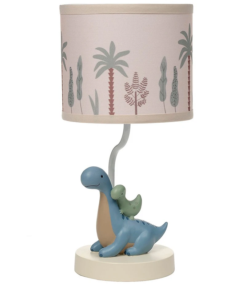 From Lambs & Ivy, this lamp features: The decorative lamp shade is a cylinder shape on a cream color ground with a variety of plants and trees Custom hand-painted dinosaur lamp will provide a soft glow in your child's room The 3-D sculpture features a blue mommy dino sitting with her sage green baby dino Resin/polyresin Will add a soft glow to your child's room Requires a standard 9 Watt LED bulb, not included Approx. 14" H including shade Spot clean Imported.
