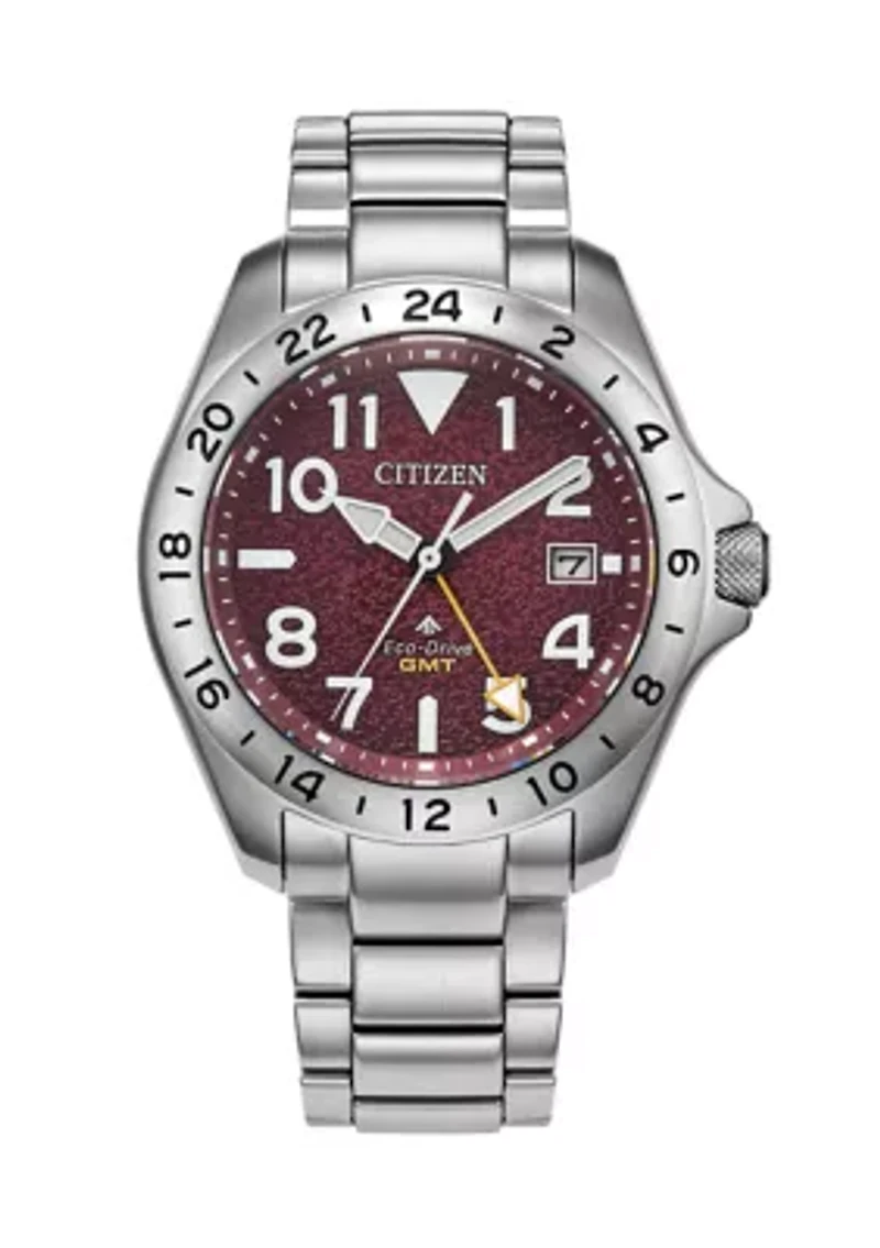 Adventure-ready and built with precision, the CITIZEN Promaster Land GMT watch delivers robust performance with travel-ready functionality. The 39.5 mm stainless steel case is water resistant up to 200 meters and topped with a curved sapphire crystal for durability in the field. Sustainably powered by any light with our Eco-Drive Caliber B877, this timepiece never needs a battery. A fixed 24-hour GMT bezel surrounds the high-contrast blue dial, accented with crisp white markers and bright yellow touches for enhanced legibility. A discreet 3 o’clock date window adds daily utility to the no-nonsense design. ISO-compliant and rugged by design, the Promaster Land GMT is secured with a grey nylon strap and arrives in a Promaster tackle box, ready for the next expedition. Buckle closure Analog dial Date display 5 years (+ 1 additional year if you register your watch on Citizen.com=6 years total) limited liability warranty available Imported Product Specifications 39.5 mm Material & Care Silver-tone metal Clean with a soft cloth