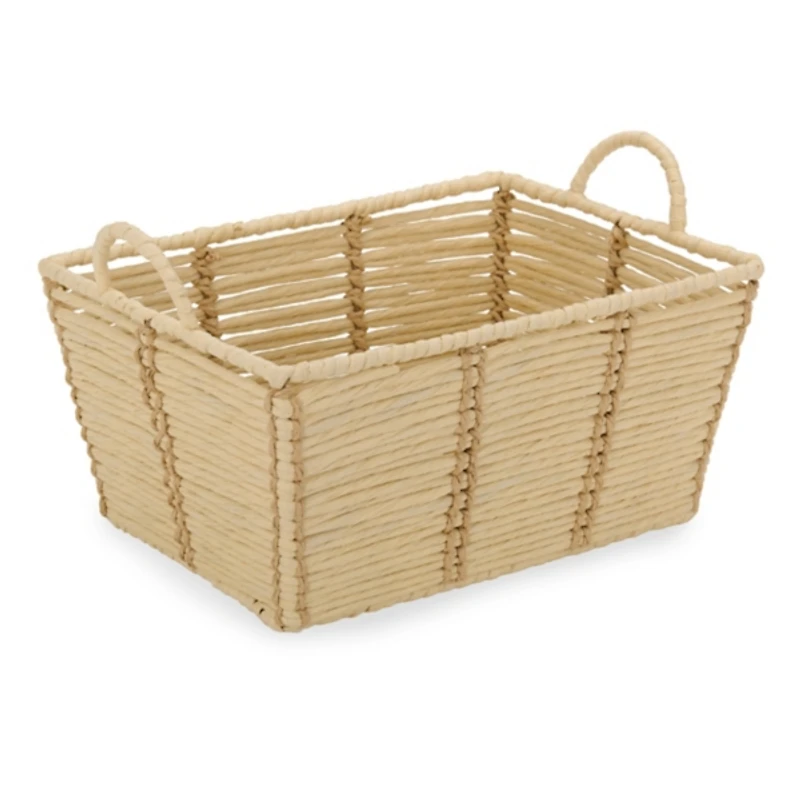 Mix handcrafted beauty into your home organization with our Large Natural Paper Stitched Basket. The stitched details add a hint of rustic texture while the light, natural hue easily blends with your decor. Basket measures 14L x 10W x 6.5H in. Handcrafted of natural materials and metal Natural finish Stitched details Carrying handles Care: Dust with a soft, dry cloth. Contact your local Kirkland's store for availability. Quantities and selection may vary by location.