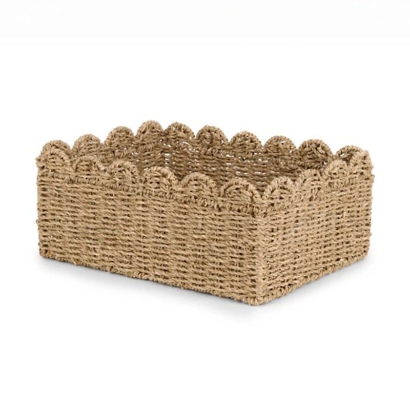 Keep a console or coffee table stylishly tidy with our Large Seagrass Scalloped Basket. It's sure to bring natural, rustic flair to your home organization with a touch of charm. Basket measures 14.1L x 10.6W x 5.9H in. Crafted of seagrass and palm leaf Woven design Scalloped edges Rectangular shape For decorative use only Care: Dust with a soft, dry cloth. Contact your local Kirkland's store for availability. Quantities and selection may vary by location. WARNING: Cancer and Reproductive Harm - For more information go to www.P65Warnings.ca.gov .