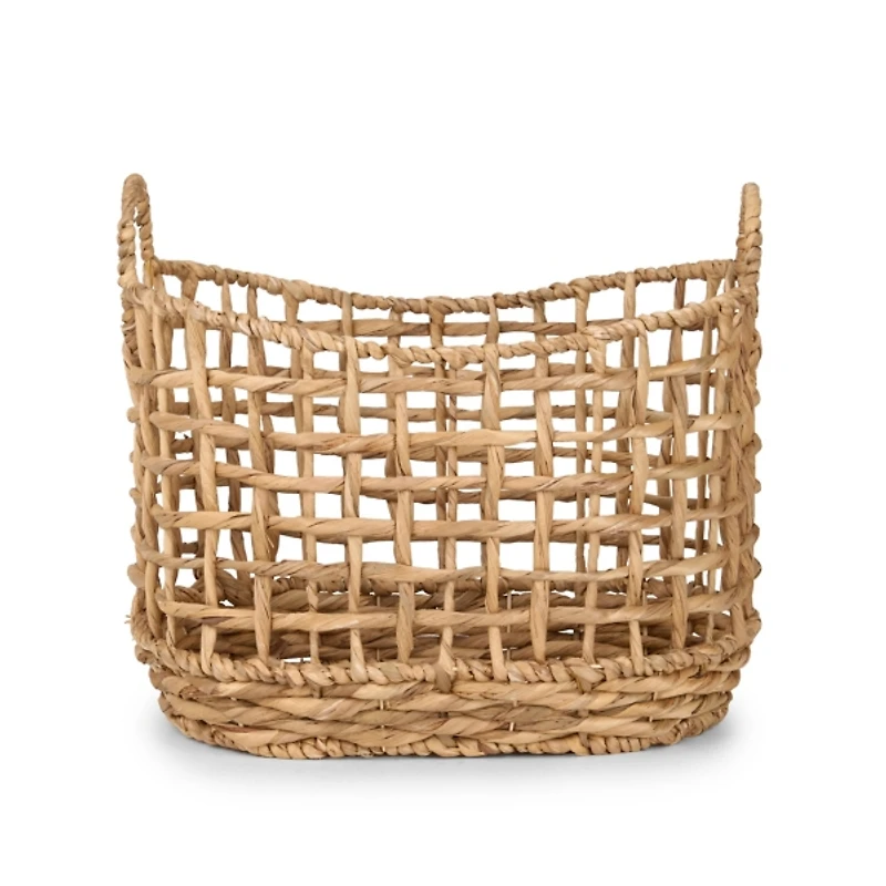 Whether you're storing magazines or throws, the Large Water Hyacinth Open Weave Basket keeps your home organized. The open weave design makes it perfect for stylish items that deserve to be seen yet tucked away. Basket measures 16.5L x 11.8W x 14.6H in. Crafted of seagrass and metal Natural finish Woven design Side handles Care: Dust with a soft, dry cloth. Contact your local Kirkland's store for availability. Quantities and selection may vary by location. WARNING: Cancer and Reproductive Harm - For more information go to www.P65Warnings.ca.gov .