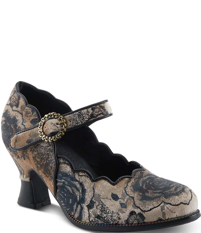 L'ARTISTE Adodora Tapestry Floral Print Velvet Buckle Hardware Mary Jane Pumps