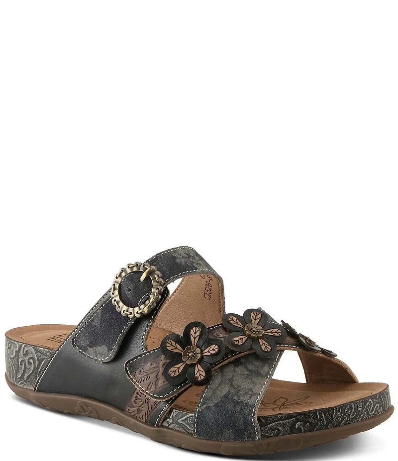 From L'ARTISTE, the Caelana Leather Flower Detailed Slide Sandals feature: Leather upper Three exquisite flowers adorn the crisscross front strap Hook and loop closure with decorative buckle Synthetic lining Soft, supportive footbed Rubber outsole Approx. 1.25" wedge height Imported.