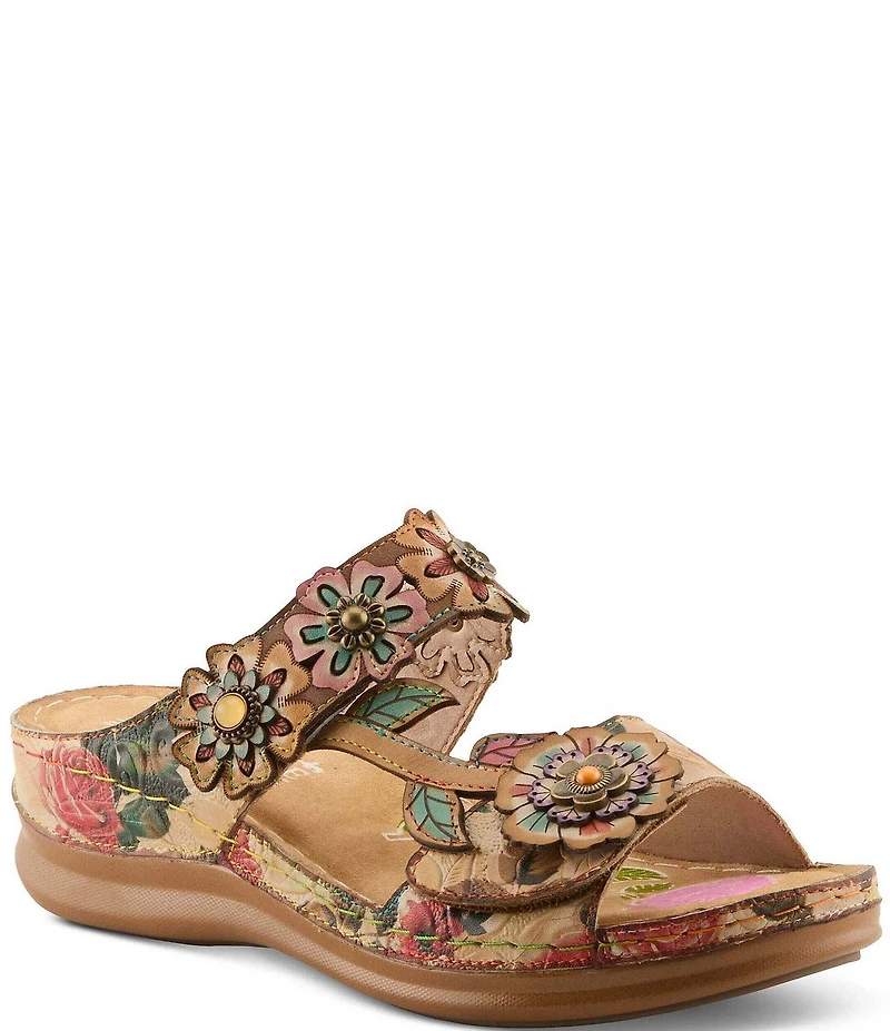 From L'ARTISTE, the Feelsgreat Hand-Painted Embossed Floral Slide Sandals feature: Embossed and hand-painted floral leather upper Dimensional 3D floral accents Slip on with adjustable hook-and-loop straps for customizable all-day comfort Synthetic lining Rubber outsole Approx. 2" wedge height Imported.