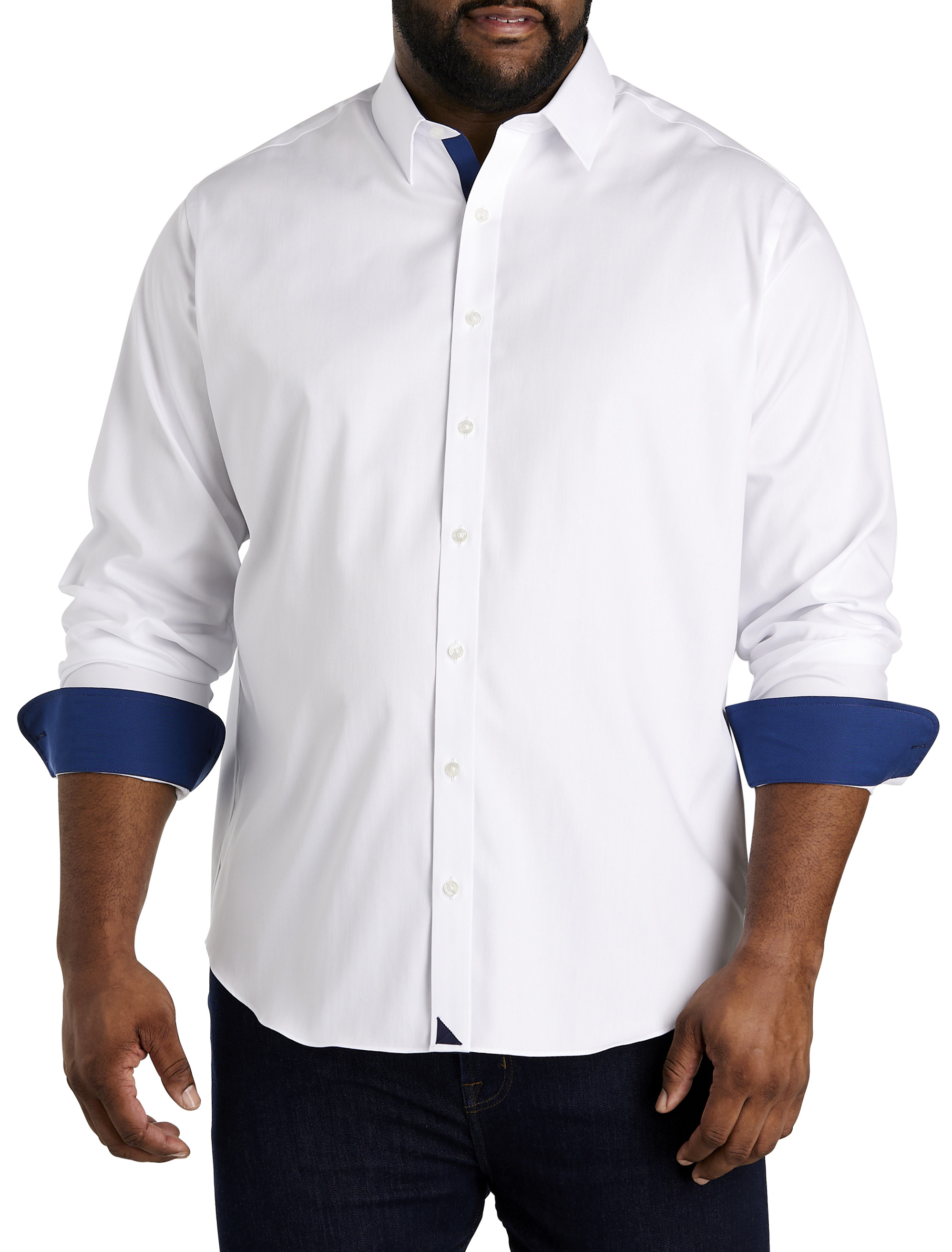 UNTUCKit perfected the untucked shirt with that just-right length and timeless style. DXL perfected the Big + Tall fit. So we’ve partnered together to let even more guys look sharp---even at their most casual. Here, they've redesigned the iconic, solid-white Las Cases shirt with a sleek point-collar and contrasting navy accents along the placket, collar, and cuff lining for a sophisticated look. Crafted in 100% cotton, it's soft, breathable and allows for the freedom to move without restriction. Available in three different lengths to properly fit and flatter the proportions of Big and Tall guys, the untucked style falls at just the right length. Whether you're wearing it with a sport coat for the office or with jeans for the weekend, it's stylish, and comfortable. Plus, the wrinkle-free fabric resists creasing and looks perfectly sharp right out of the dryer, making it a great choice for travel or everyday wear. Please choose appropriate size based on your height: 6’ 0” and under: 2XL-5XL 6’ 0” - 6’ 4”: 1XLT-5XLT over 6’ 4”: 1XXLT-4XXLT