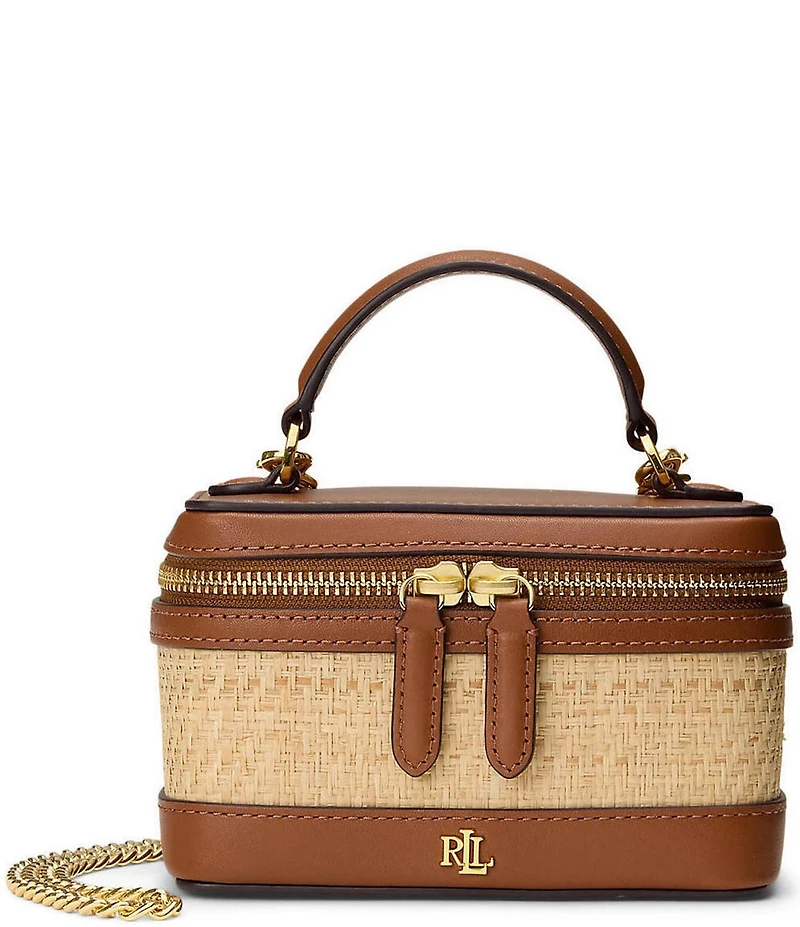 From Lauren Ralph Lauren, the Hallee Raffia Vanity Crossbody Bag features: Woven raffia construction with sumptuous leather trim Full-grain embossed leather  Lining is made with polyester and recycled polyester Includes a dust bag Detachable chain strap for hands-free styling Two-way zip-around closure Brass-finished “LRL” logo at the front Brass-finished plaque custom-developed with a “Lauren Ralph Lauren est. 1967” logo at the interior Approx. Weighs approximately 14-oz. Leather top handle with a 2.5" drop Removable chain strap with a 22" drop Approx. 3.75" H x 5.75" L x 3.25" W Spot clean with a soft, dry cloth Imported.