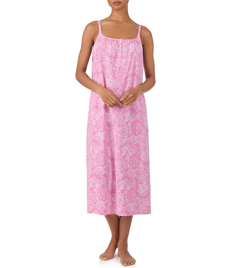 From Lauren Ralph Lauren, this nightgown features: Paisley print Jersey knit fabrication Scoop neckline Partial button placket Sleeveless LRL embroidered at the chest Double strap Side seam pockets Side slits Pullover construction Approx. 46" length Cotton Machine wash cold/tumble dry low Imported.