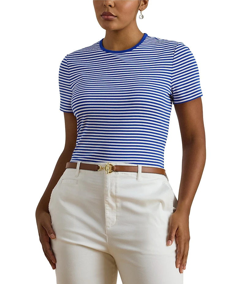 From Lauren Ralph Lauren Plus, this tee features: Lightweight stretch cotton fabrication Ribbed crew neckline Short sleeves Stripe Slim fit Intended to hit at the hip “LRL”-embroidered logo at the front right hem Straight hem Pullover construction Approx. 27.5" body length Body length is taken from the high point of the shoulder Cotton/elastane Machine washable or dry clean Imported.