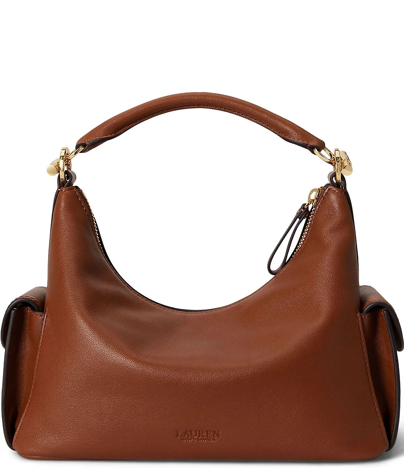 From Lauren Ralph Lauren, the Small Blaike Shoulder Bag features: Leather exterior Brass hardware Top zip closure Polyester lining Interior zip pocket Two exterior snapped-flap cargo pockets Top handle with a 6" drop Removable, adjustable crossbody strap with a 24" maximum drop Approx. 7.5" H x 10" L x 4.75" D Imported.