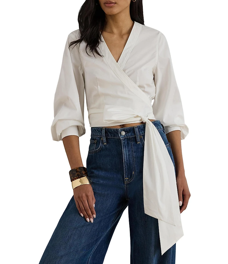 Lauren Ralph Lauren Stretch Cotton V-Neck Long Sleeve Wrap Blouse