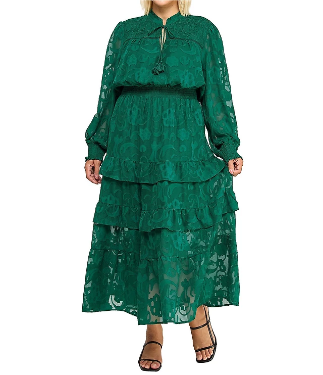 Layered With Love Plus Size Alice Jacquard Chiffon Long Sleeve V-Neck Ruffle Tiered A-Line Maxi Dress