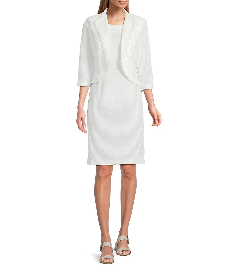 From Le Bos, this jacket dress features: Jacket: Crinkle knit fabrication Collared open neckline 3/4 sleeves Pearl trim Approx. 18.38" in length Polyester/spandex Hand wash Dress: Crinkle knit fabrication Round neckline Sleeveless Sheath silhouette Pearl trim Center back zipper closure Approx. 39.63" in length Polyester/spandex Hand wash Imported.