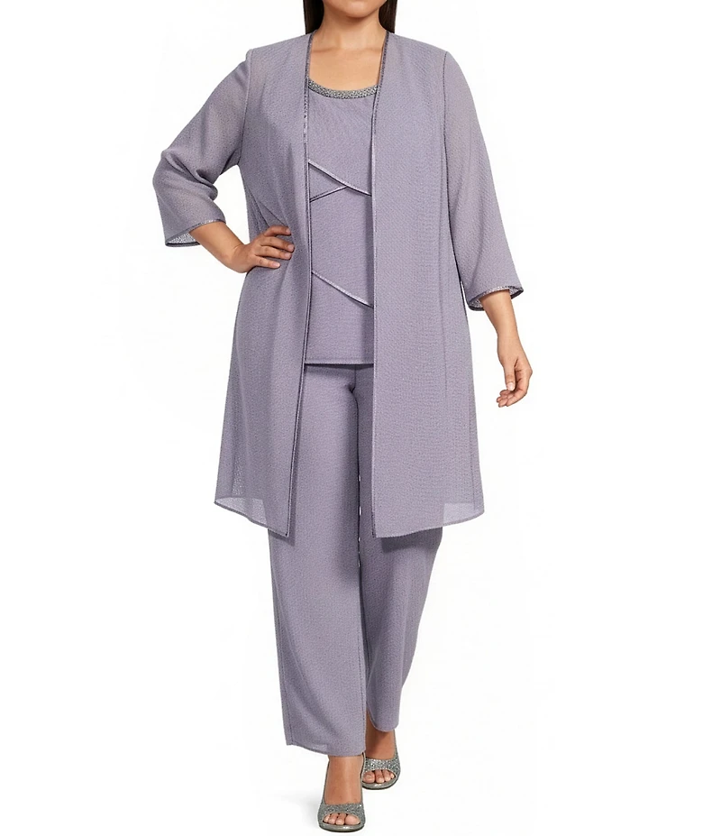 Le Bos Plus Size Pebble Georgette Satin Trim Beaded Scoop Neck 3/4 Sleeve 3-Piece Pant Set