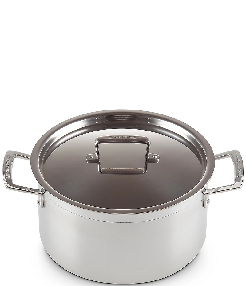 From Le Creuset, this stockpot features: The tri-ply construction of the Classic Stainless Steel Stock Pot conducts and distributes heat evenly. The full aluminum core delivers excellent heat distribution for quick and even heating, while the satin matte stainless steel exterior resists scratches, marks and fingerprints. Designed for those who love to cook, non-reactive stainless steel is easy to use, exceptionally versatile and dishwasher-safe. A full aluminum core heats quickly and evenly, and is protected by the rolled, sealed and polished rim Interior laser-etched capacity markings Inside layer is made of surgical-grade stainless steel for a safe and stable cooking surface Inside layer is made of surgical-grade stainless steel for a safe and stable cooking surface Premium steel blend resists pitting and scorching to maintain its luster over time Dishwasher safe Measures 6.25-quart Imported.