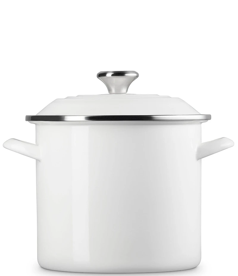 From Le Creuset, the Enamel-On-Steel Stockpot With Stainless Steel Knob - 8-Qt. features:  Tall straight sides and large capacity make enamel on steel Stockpots ideal for soups, stocks, cooking pasta and boiling seafood. Available in a range of convenient sizes, they deliver our fastest-heating performance of premium carbon steel glazed in our beautiful palette of colors. Lightweight and durable, carbon steel rapidly brings water to a boil to speed up prep and cooking and retains heat to keep food and liquids warm. The easy to clean colorful porcelain enamel coating is non-reactive and resistant to stains and flavors, making enamel on steel stockpots ideal for everyday use.  Enamel on steel Crafted from responsive and lightweight carbon steel to quickly bring water to a boil Excellent heat retention to keep food and liquids warm Vibrant porcelain enamel is non-reactive, nonporous, and resists stains, rust, scratches and flavor absorption Stainless steel rim around the top edge prevents chipping and cracking Heat-resistant knobs stay cool to the touch for safe, secure handling Dishwasher safe Approx. capacity 8-quart  Imported.