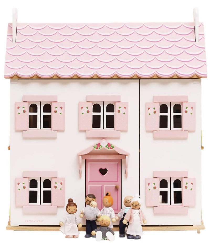 From Le Toy Van Honeybake, this dollhouse features: In fresh white & rose pink this fully painted and decorated large 3 story doll's house features a glittery scalloped roof, a front porch, opening and closing shutters and windows, and a floral motif. The house won the Right Start Toy Award, the Top 100 Baby Products and the Toy Talk Award. Sophie's House includes a wooden staircase that plays the role of room divider. Fully painted and decorated, the wallpaper is full of details children love to spot. It also defines room spaces with a color for each floor and a different pattern for each room. Dolls and accessories sold separately. Approx. dimensions: W:24", D: 13.8", H:26.3" Safe toy - Decorated with non-toxic paints and tested to the highest safety standards Toys are made from sustainably sourced Rubberwood, repurposing trees that have reached the end of their rubber-giving lives, replanting to maintain the precious eco-system and support the local community. Assembly required Recommended for ages 3+ Imported