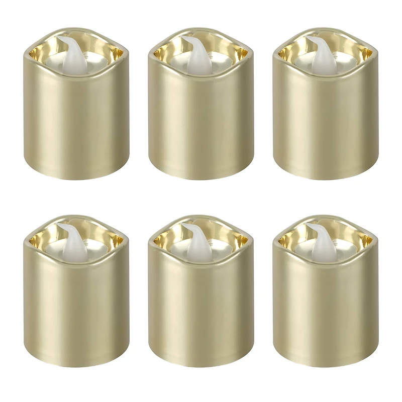 Create an inviting space this Christmas as you light up the room with these stylish flameless candles. Perfect to place on shelves, counters and side tables, these small battery-operated flickering votives will fill your holiday home with joy.Details:Available in multiple colors1.5" x 1.5" x 1.9" (3.81cm x 3.81cm x 4.83cm) each6 candlesWarm white LED lightsRequires 1 CR2032 battery (included)Plastic, PVC and electronic componentsFor indoor decorative use onlyNot a toy