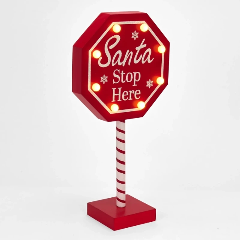 Make your home merry and bright with this festive LED Santa Stop Here Tabletop Sign! Designed to capture the magic of Christmas, this sign casts a cozy seasonal glow. Sign measures 7.87L x 3.94W x 15.75H in. Crafted of MDF and plastic Features LED lights and the text, "Santa stop here" Hues of red and white Requires two (2) AAA batteries; batteries not included On/off switch; no timer For indoor use only Care: Dust with a soft, dry cloth. Contact your local Kirkland's store for availability. Quantities and selection may vary by location.
