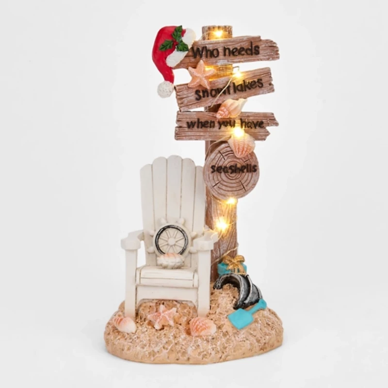 Spending Christmas on the shore? Light up your holiday display with our LED Who Needs Snowflakes Christmas Decoration. It's perfect for anyone having a coastal Christmas! Decoration measures 4.25L x 4W x 8H in. Crafted of resin Features a beach scene Accented with the text "Who needs snowflakes when you have seashells" LED design Hues of tan, beige, ivory, and brown Timer settings: 8 hours on, 16 hours off Requires three (3) AAA batteries; batteries not included Care: Dust with a soft, dry cloth. Contact your local Kirkland's store for availability. Quantities and selection may vary by location. WARNING: Cancer and Reproductive Harm - For more information go to www.P65Warnings.ca.gov .