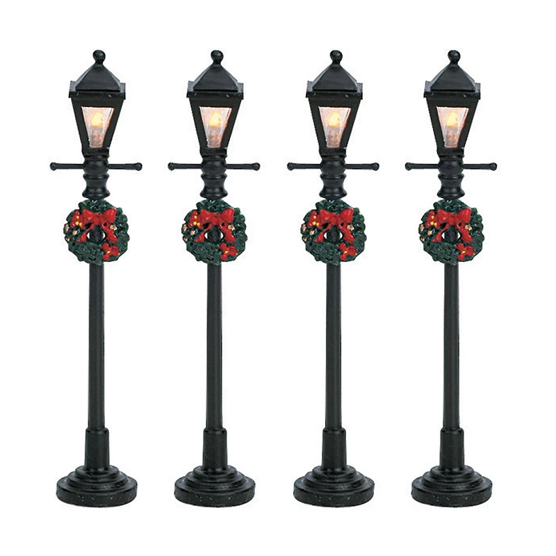 Add classic black, cast-iron-like Gas Lantern Street Lamp to a Christmas Village scene and you'll have a source of light and a vintage, eye-catching feature. Each lamp, which come in a set of four, features a festive wreath and a bright, working light.Approx. size (H x W x D): 4.13" (10.5 cm)Year released: 2006Made of: PlasticProduct type: AccessoriesControl switch: On/Off switchBatteries: Uses three AA size 1.5V batteries - batteries not includedElectrical: A/C adaptable by using a Lemax Power Adaptor. Adaptor not included
